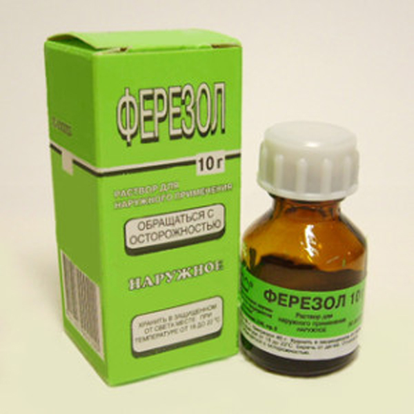 - Ферезол. Використовується в якості антибактеріального і прижигающего кошти. Ферезол достатньо ефективний, проте, при нанесенні на шкіру може викликати неприємні відчуття печіння.