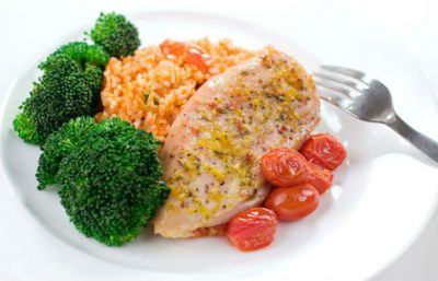 - обід: суп овочевий, запечена куряча грудка і гарнір з вареної гречки, склянка чаю;