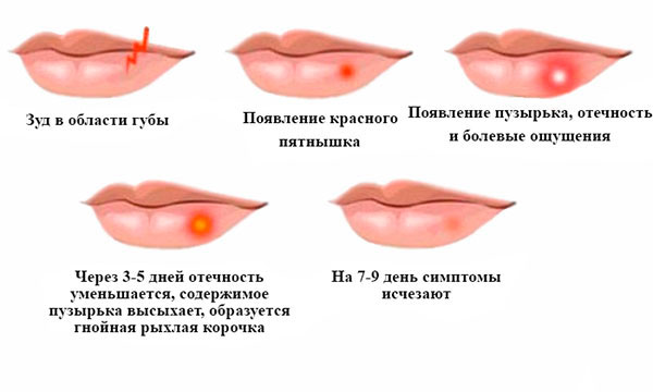 Типова клініка при герпесі така: за день до висипань людина починає відчувати поколювання, печіння. Через добу в цій зоні з’являється почервоніння з набряком, починають формуватися маленькі бульбашки. Спочатку їх вміст прозоре, незабаром каламутніє. Потім на їх місці утворюються ерозії, покриті скоринкою. Приблизно через тиждень ці кірочки відпадають, на їх місці видно темний слід. Він через деякий час теж пропадає. Якщо рецидиви трапляються часто, то після висипань залишаються маленькі рубці.