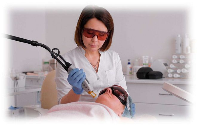 Потім пацієнт і косметолог надягає спеціальні окуляри. Вони захищають очну клітковину від випромінювання.