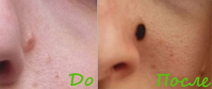 Місце обробки стає твердим і болючим. Через добу, на цьому місці утворюється пухир з прозорою рідиною. Потім все затягується скоринкою, яка через місяць відпадає самостійно. На місці минулого папіломи буде нова рожева тканина епітелію.