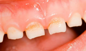 Найбільш схильні до карієсу верхні різці та ікла. Дитина грудного віку не може розповісти про свої відчуття, але він морщиться і плаче під час їжі. Він відмовляється їсти, погано спить, часто прокидається з криком. На цій стадії карієс вже досить помітний, тому уважний батько зверне увагу на почорніння зубів. На фото представлений ранній карієс.