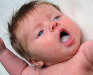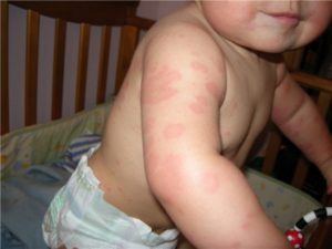 При великому скупченні токсинів в організмі дитини імунна система збільшує вироблення захисних лейкоцитів (еозинофілів), що призводить до алергічної реакції на шкірі.