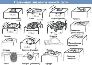 Щоб правильно діагностувати захворювання необхідно розрізняти висипання по морфологічним особливостям. За первинними ознаками елементи висипу класифікуються на такі види: