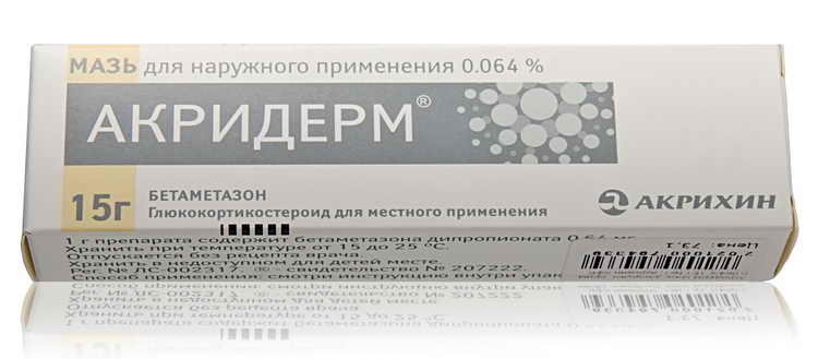 - Акридерм. Мазь для шкіри. Призначається, якщо висипання сверблять або доставляють інший дискомфорт. Справляється з шкірними проблемами, викликаними алергією. Аналог – Тридерм.
