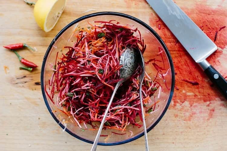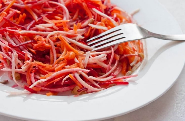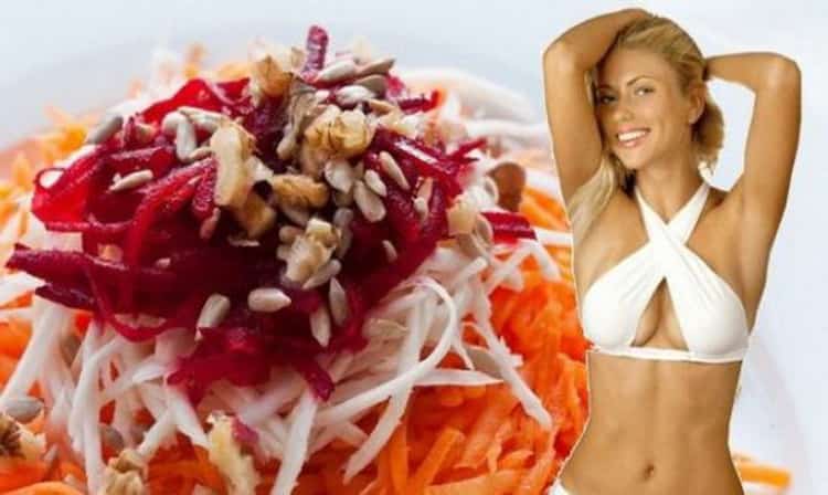 А хитрість в тому, що всі овочі, що входять до складу цього салату, володіють так званою негативною калорійністю. Це означає, що для їх перетравлення організм витрачає більше енергії, ніж одержує в підсумку. Буряк, один з його основних компонентів, чудово очищає кишечник і є багатим джерелом клітковини, так необхідної для нормального травлення.