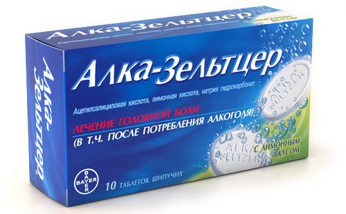 Це ліки — класика боротьби з похмільним синдромом. Аспірин в хімічному складі засобу забезпечує м’яке коронаророзширювальний дію, знімає пітливість і озноб, купірує напади головного болю. Додаток ацетилсаліцилової кислоти гідрокарбонатом натрію і лимонною кислотою забезпечує приведення в норму кислотності шлунка. Таким чином, «Алка-Зельтцер» нормалізує кислотність і перистальтику, м’яко бореться з нудотою.