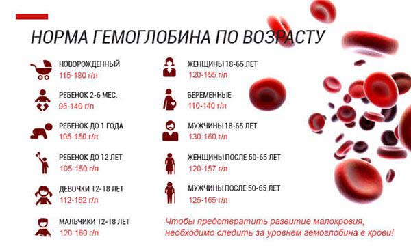 При постановці діагнозу враховується стать і вік пацієнта: для дорослих чоловіків норма становить 130-160 г/л, для жінок — 120-150 г/л, для дітей трьох-шести місяців — 95-135 г/л.