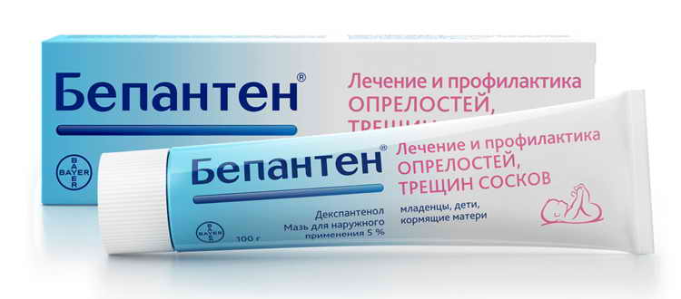 - Бепантен. Головною діючою речовиною є декспантенол, який здатний запускати і підсилювати регенерацію шкірних покривів. Також препарат допомагає зберігати рівень вологості.