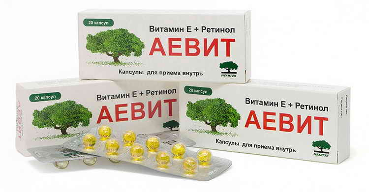 - Аевіт. Містить велику кількість вітамінів А і Є. Прекрасно працює як в якості внутрішнього препарату, так і в якості доповнення до масок і кремів зовнішньо. Має відновлюючі властивості. Може пом’якшувати шкіру і утримувати в ній вологу.
