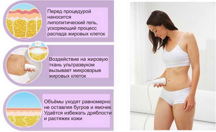 Суть даної процедури полягає в тому, що жирові клітини впливає низькочастотний ультразвук. Під час впливу вони вибухають і утворюють мікропухирців. Далі вони стають більшого розміру і починають виділяти особливу енергію, яка руйнує оболонки колишніх жирових клітин.