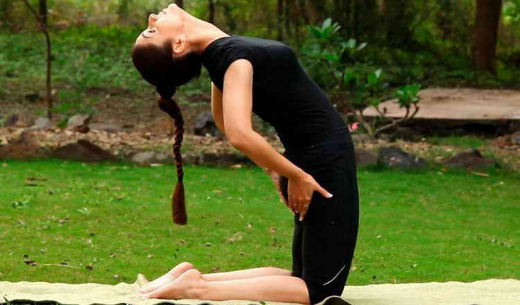 Стоячи на колінах, розведіть їх на ширину плечей. Повільно нахиліть голову вперед, притиснувши підборіддя до грудей. Роблячи вдих, відкиньте голову назад, повільно прогинаючи хребет. Спирайтеся руками на стегна. Видихаючи, поверніться у вихідне положення. Робіть можливу кількість разів, з кожним днем збільшуючи до 20 повторень.