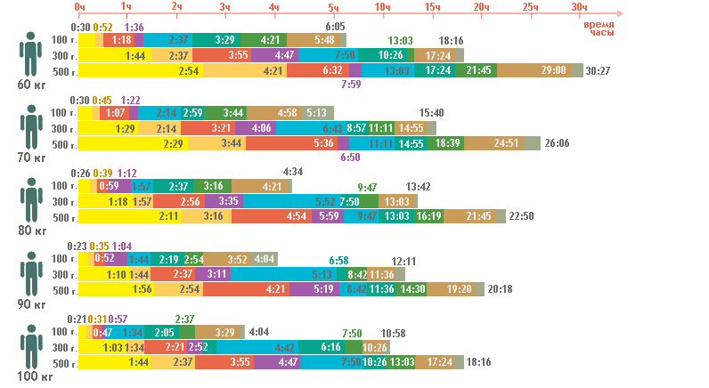У таблиці наведено часові проміжки, протягом яких алкоголь повністю перестає впливати на організм середнього чоловіка. Час виведення алкоголю з організму жінок на 20% довше.