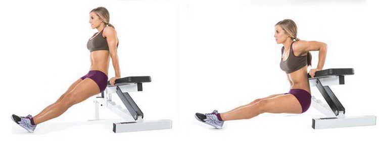 6. Відведеними назад руками беремося за край лави. Таз повинен розташуватися на рівні сидіння лави. Ноги згинаємо в колінах, на вдиху згинаємо руки і поступово опускаємо тіло до тих пір, поки плечі не виявляться паралельно підлозі, завмираємо на півхвилини в такому положенні. Не забуваємо – лікті повинні бути притиснуті до тулуба.