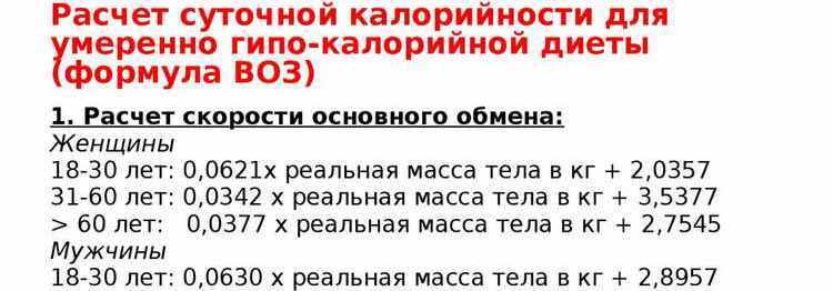 ВООЗ вивела власний спосіб вираховування калорій, яка знижує вагу і дозволяє підтримувати оптимальну масу тіла. Підраховується добова потреба в калоріях залежно від віку та інших показників. Детальний опис розрахунку калорій за методикою ВООЗ представлено на зображенні: