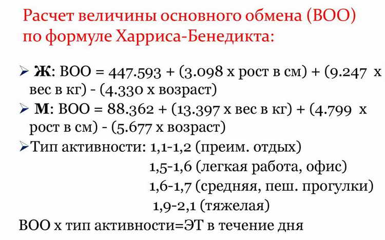Формула стала відомою у 1919 році, і до 30-х років залишалася єдиною, яка допомагає вирахувати потреба окремої людини калорій на добу. Розрахунок виконується, виходячи з ваги, зросту та активної діяльності жінки. На картинці представлений докладний розрахунок добової потреби калорій для схуднення, згідно з методикою Харріса-Бенедикта.