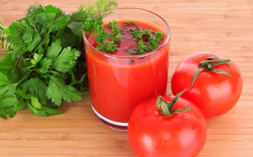 Позбутися від головного болю допомагає при похміллі томатний сік. Його п’ють в чистому вигляді, а також у суміші з перцем, яйцями. Особливою популярністю користується коктейль «кривава очей». Для його приготування в половину склянки соку вливають сирий жовток, без білка. Підсолюють суміш і випивають, не розмішуючи. В томатах містяться органічні кислоти, серед яких янтарна — активатор метаболічних процесів самоочищення організму.