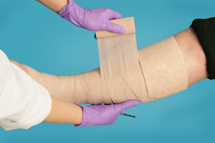 Після нанесення троксевазин на запалені вени, руки обмотуються бинтами.