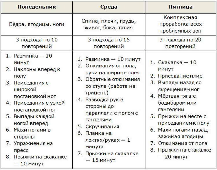 Як правило, всі тренери дають як кардіо, так і силові тренування для схуднення. Навіть мінімально навантаження на все тіло з базовими вправами повинна бути присутньою в програмі. Нижче ви знайдете невеликий стандартний план тренувань для тих, хто хоче схуднути і привести своє тіло у форму.