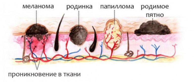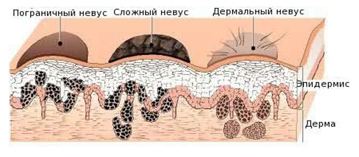 В залежності від розташування в шарах шкіри родимки підрозділяють на наступні види: