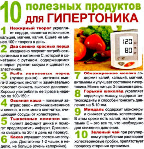 Таким чином, дієта при підвищеному тиску повинна забезпечувати організм всіма необхідними вітамінами і мінеральними речовинами і в той же час гарантувати своєчасний висновок зайвої солі і рідини з організму. Цьому сприяють продукти, що містять у великій кількості калій: багато видів бобових, картопля, огірки, сухофрукти. Горіхи теж містять калій, але це дуже калорійний продукт, тому в більшості випадків не радять.